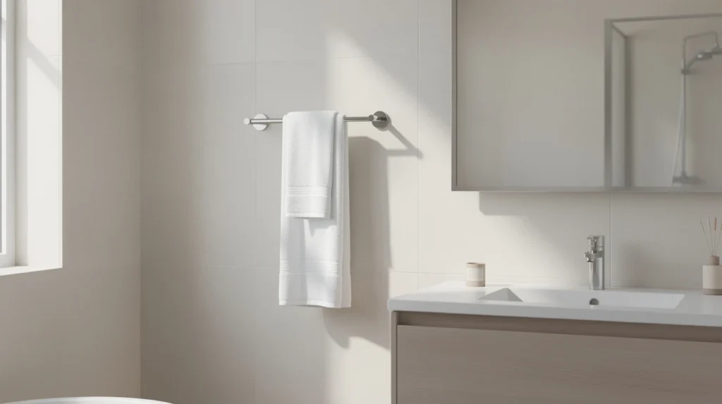 Tout d’abord, le choix de l’emplacement et de la hauteur du support impacte votre confort quotidien. Notamment, il convient de positionner la barre ou le crochet à une hauteur comprise entre 120 et 140 cm du sol pour un accès facile. De plus, l’emplacement doit permettre une circulation fluide autour du lavabo, de la douche ou de la baignoire, sans gêner l’ouverture des meubles ni du meubles angle salle bain.